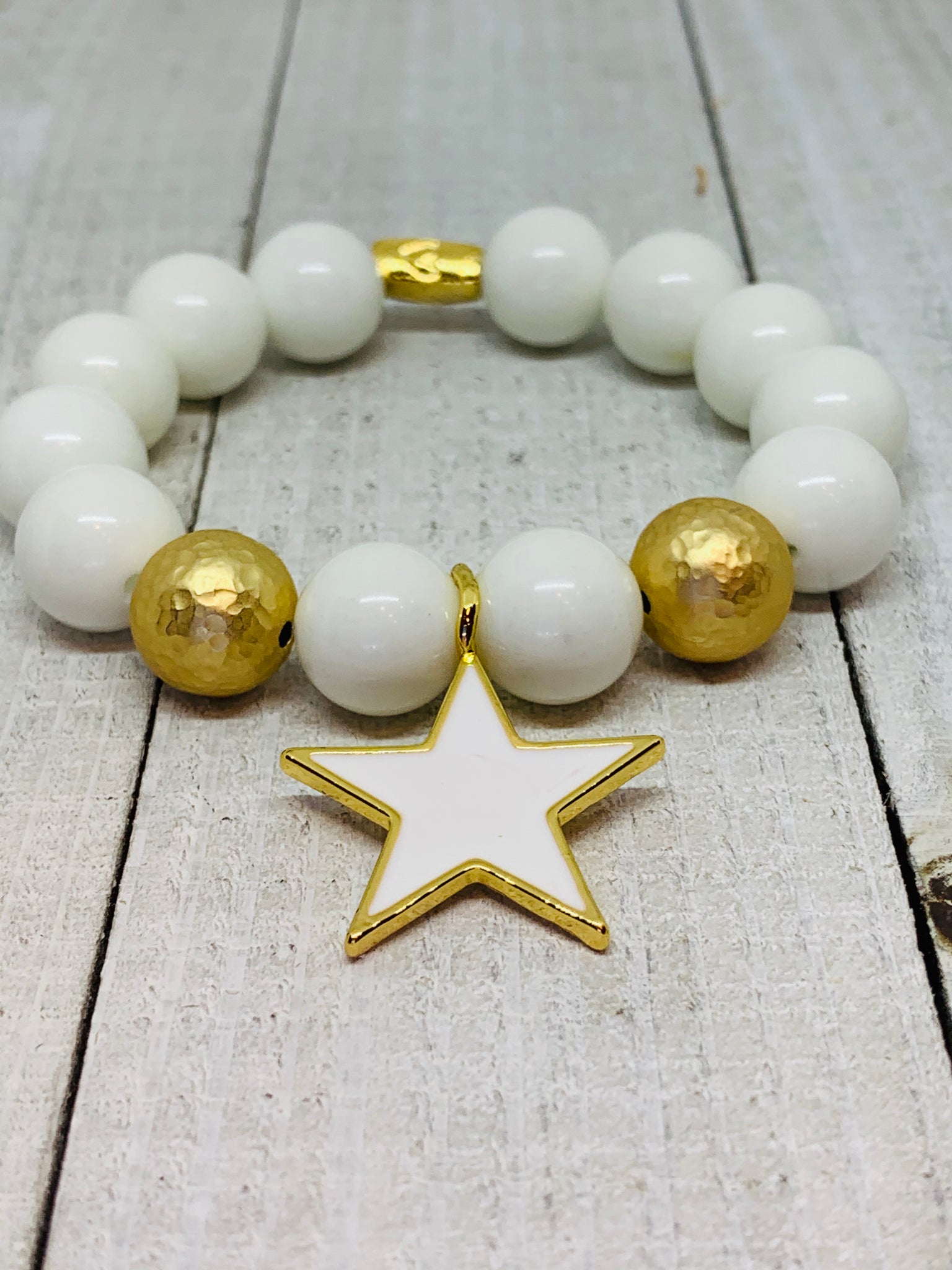 12 mm White Mountain Jade Beads with 2- 12 mm Matte Gold Hammered Beads and a Large White Enamel Star Charm and Love Finding.