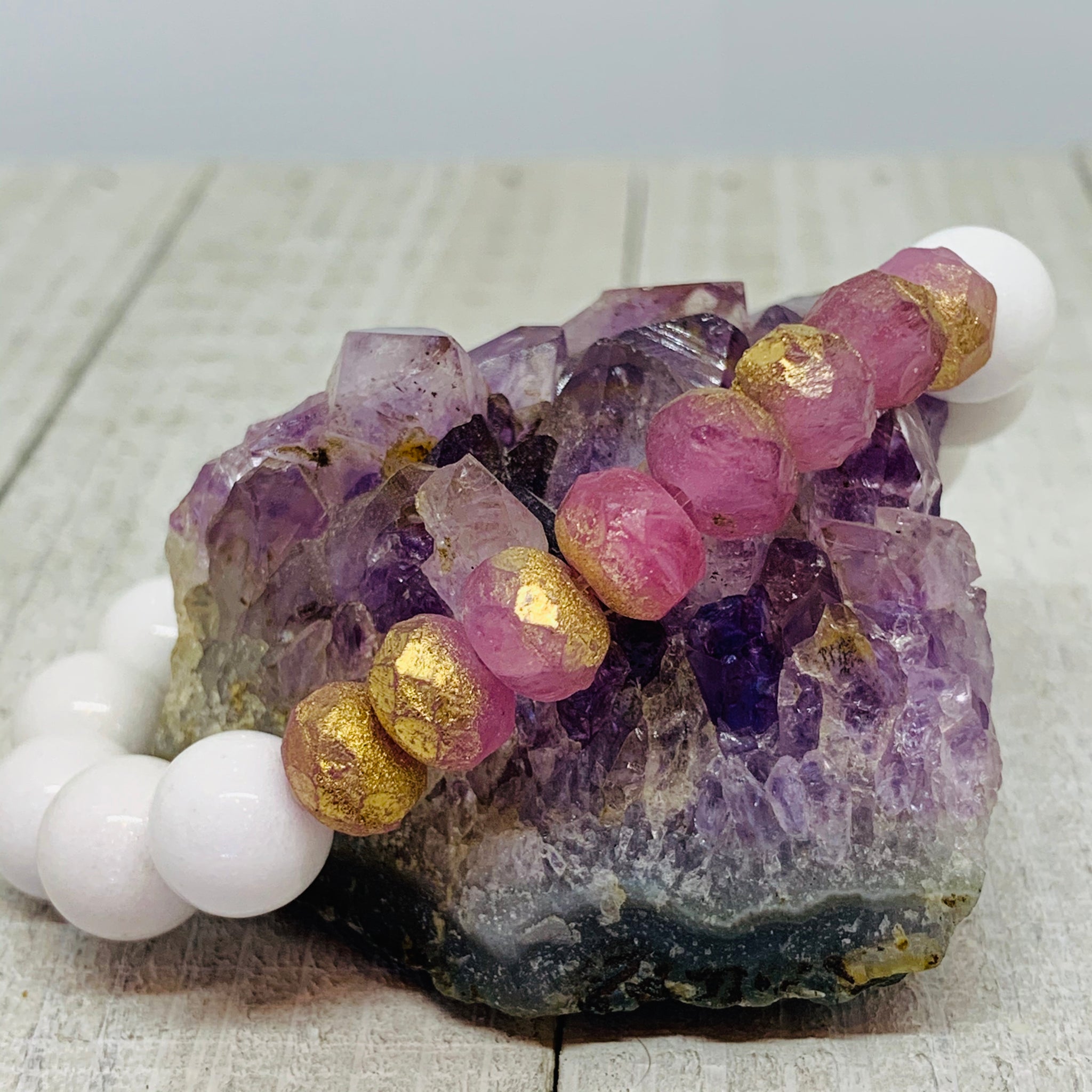 White Mashan Jade and Etched Pirnk & Gold Rondelle Bracelet